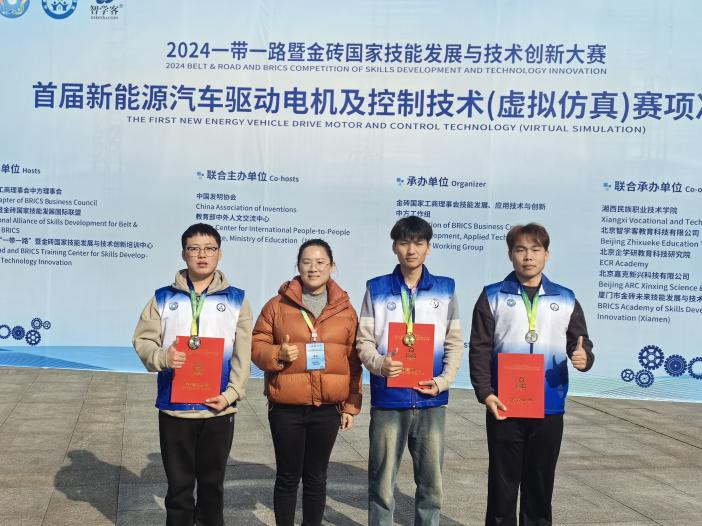 12月1日,2024一带一路暨金砖国家技能发展与技术创新大赛首届新能源汽车驱动电机及控制技术(虚拟仿真)赛项决赛落下帷幕,Beat365中文官方网站的师生团队凭借扎实的专业技能和出色的赛场表现,在全国119支参赛队伍中脱颖而出,成功斩获一等奖一项,二等奖两项的优异成绩。