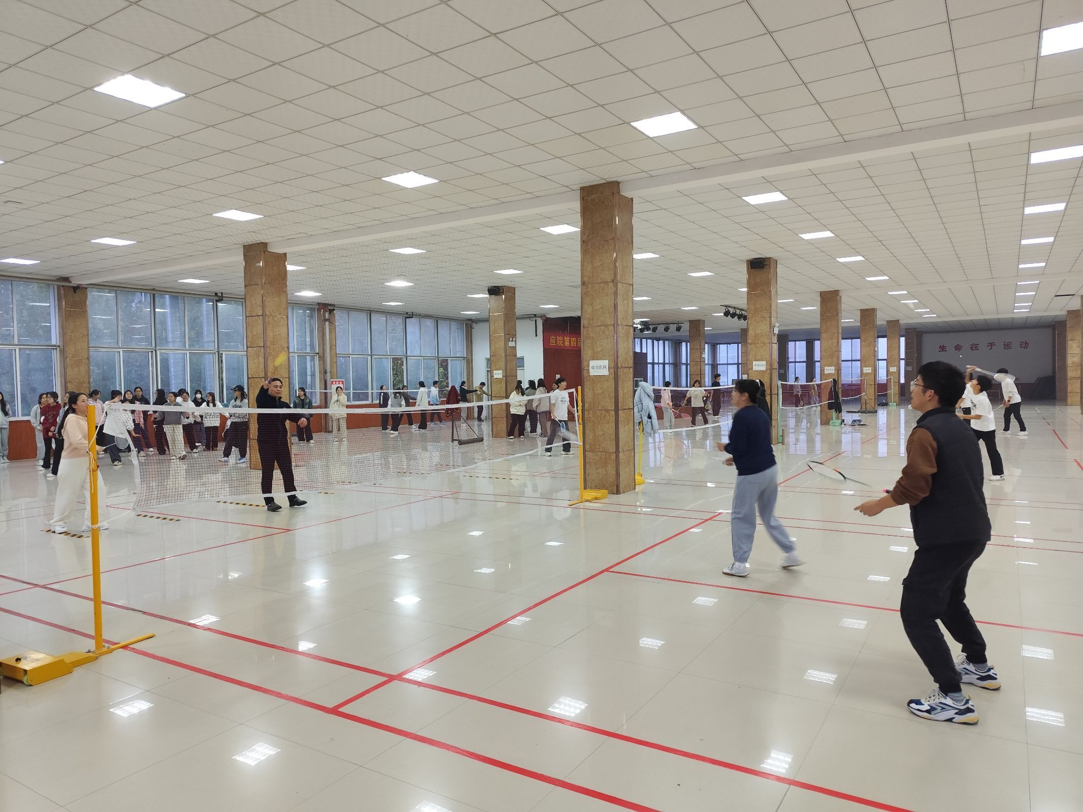 为丰富教职工的业余文化生活,增强教职工的身体素质,促进教职工之间的交流与沟通,2024年11月12日下午,在学院党总支孙丽娜书记和仵征副院长的带领下,于学校南院三楼羽毛球场进行羽毛球运动。